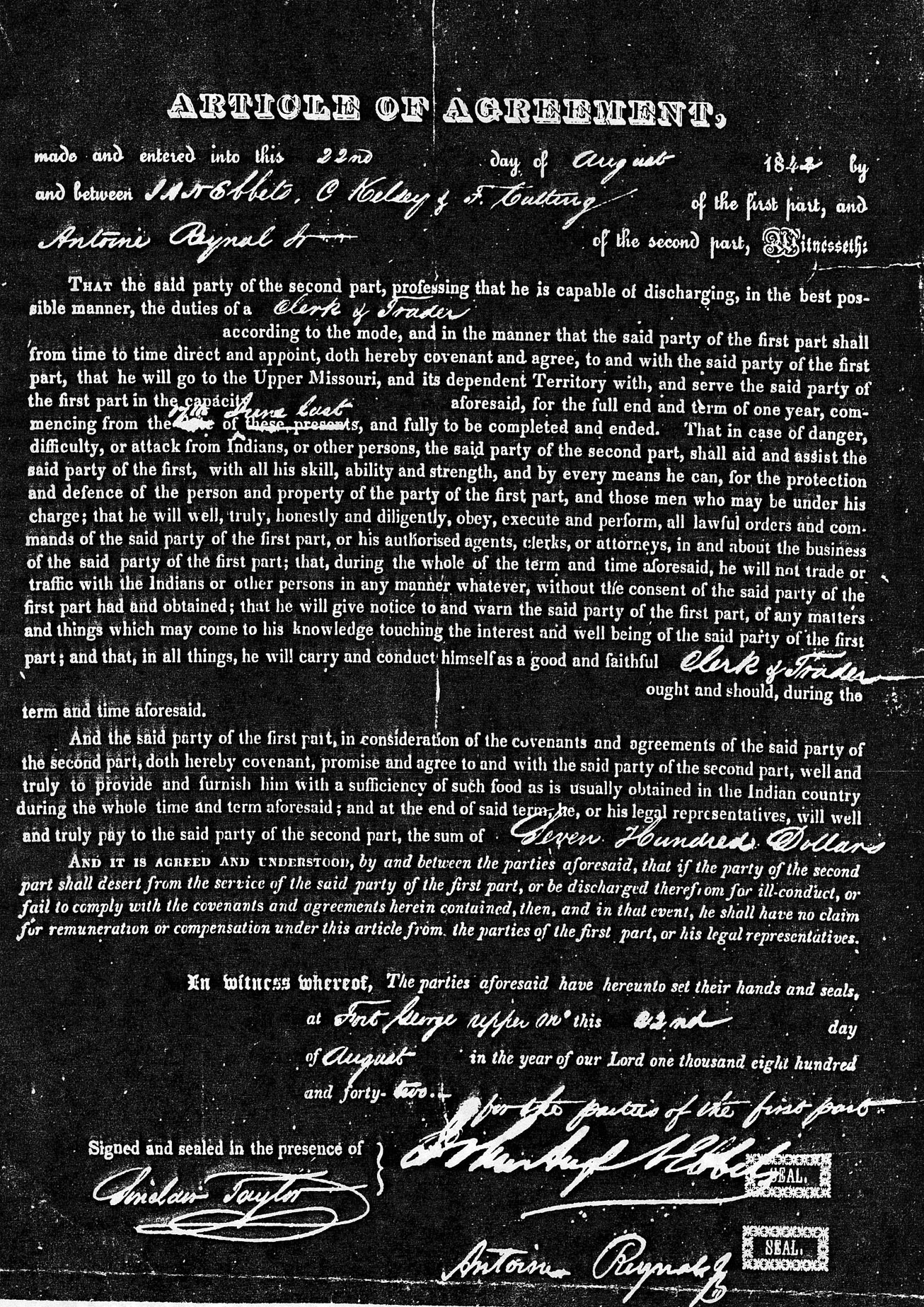 Antoine Reynal's last will and testament was written in French and is dated April 24, 1820. The original of his will is in the archives of the Missouri Historical Society in St. Louis. A copy of this will was obtained by the author and was translated into English by Mr. Francois Vigeron, a French native living in Rowlett, Texas. This will reads as follows: